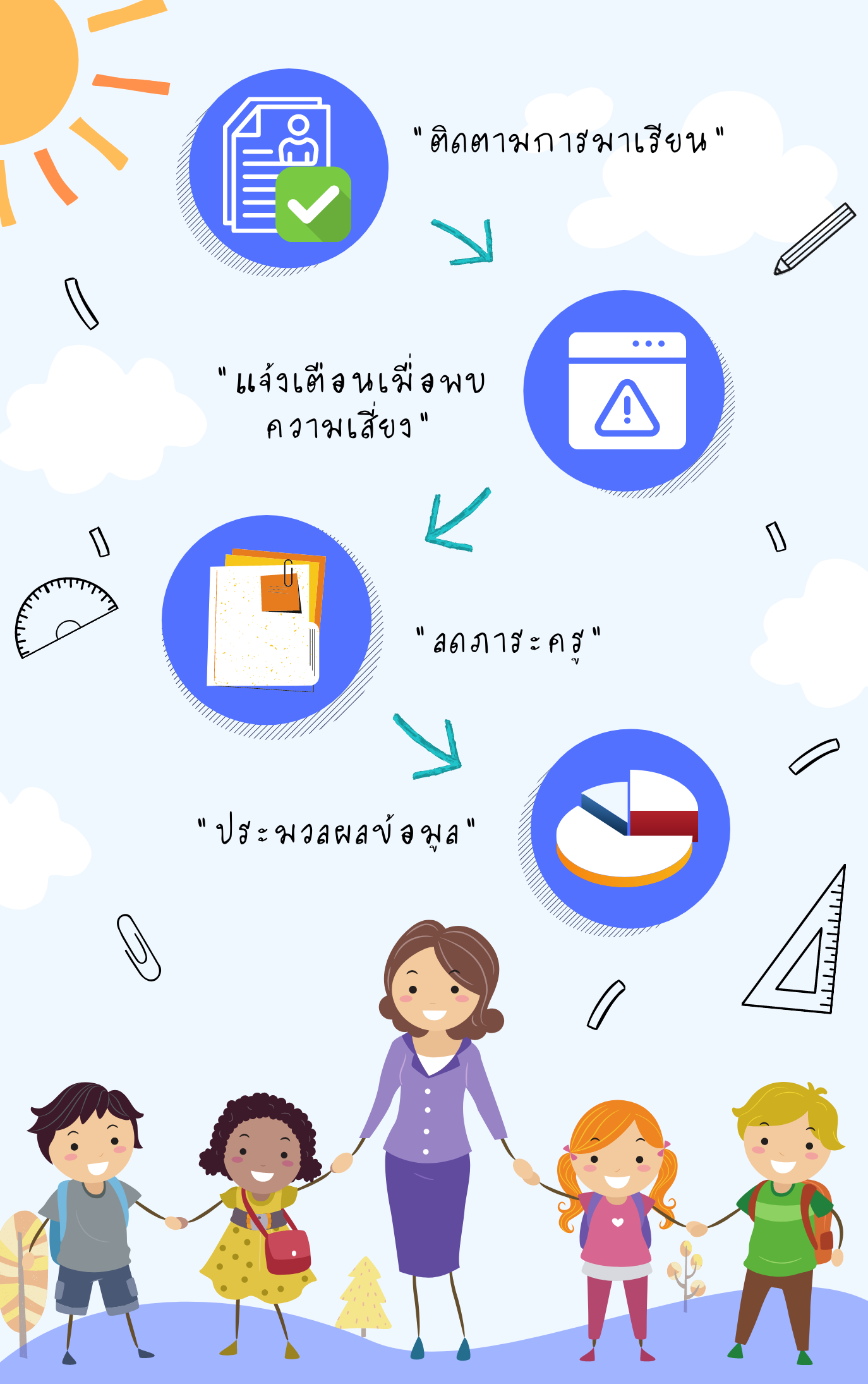 1. เพื่อติดตามนักเรียนเป็นรายคนอย่างต่อเนื่อง สามารถติดตามสถิติการมาเรียน-ขาดเรียนรวมถึงผลการเรียนของนักเรียนเป็นรายคน